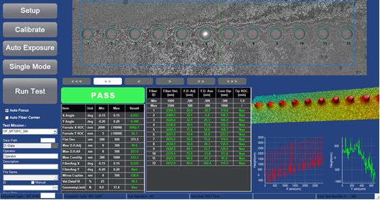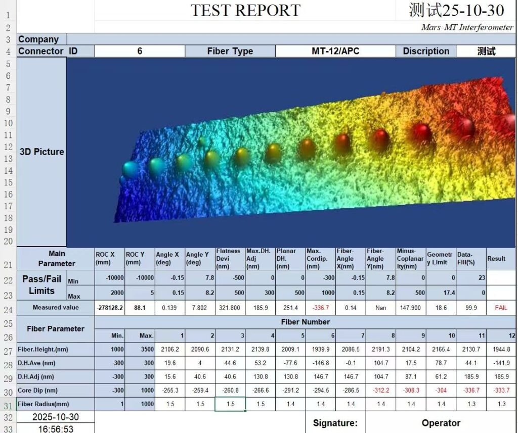 When testing multi-core samples, the device can complete a single measurement in as fast as 3 seconds. For single-core samples, a single measurement can be achieved in as little as 0.3 seconds, making it one of the fastest interferometers on the market. After testing, the device automatically generates high-definition 3D renderings, 2D color maps, and curve fitting graphs, allowing users to intuitively observe the surface morphology of the connectors.