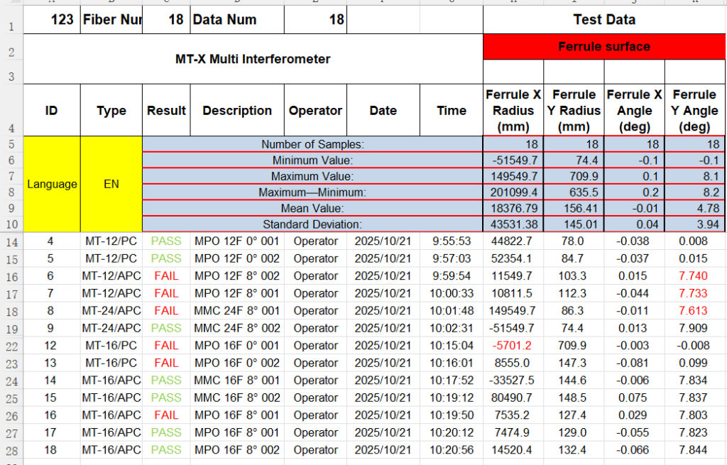 The product utilizes white light and red light interference principles to reconstruct the geometric shape of optical fiber end faces, thereby calculating various technical parameters. In addition to measuring multi-core fiber optic connectors such as MT and MTRJ , it is also compatible with conventional single-core connectors like FC, SC, ST, LC, and MU. This makes it an essential inspection device in the production process of fiber optic connectors.